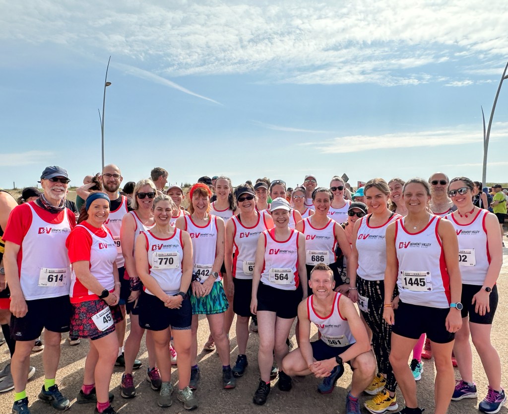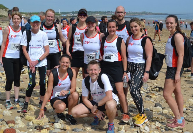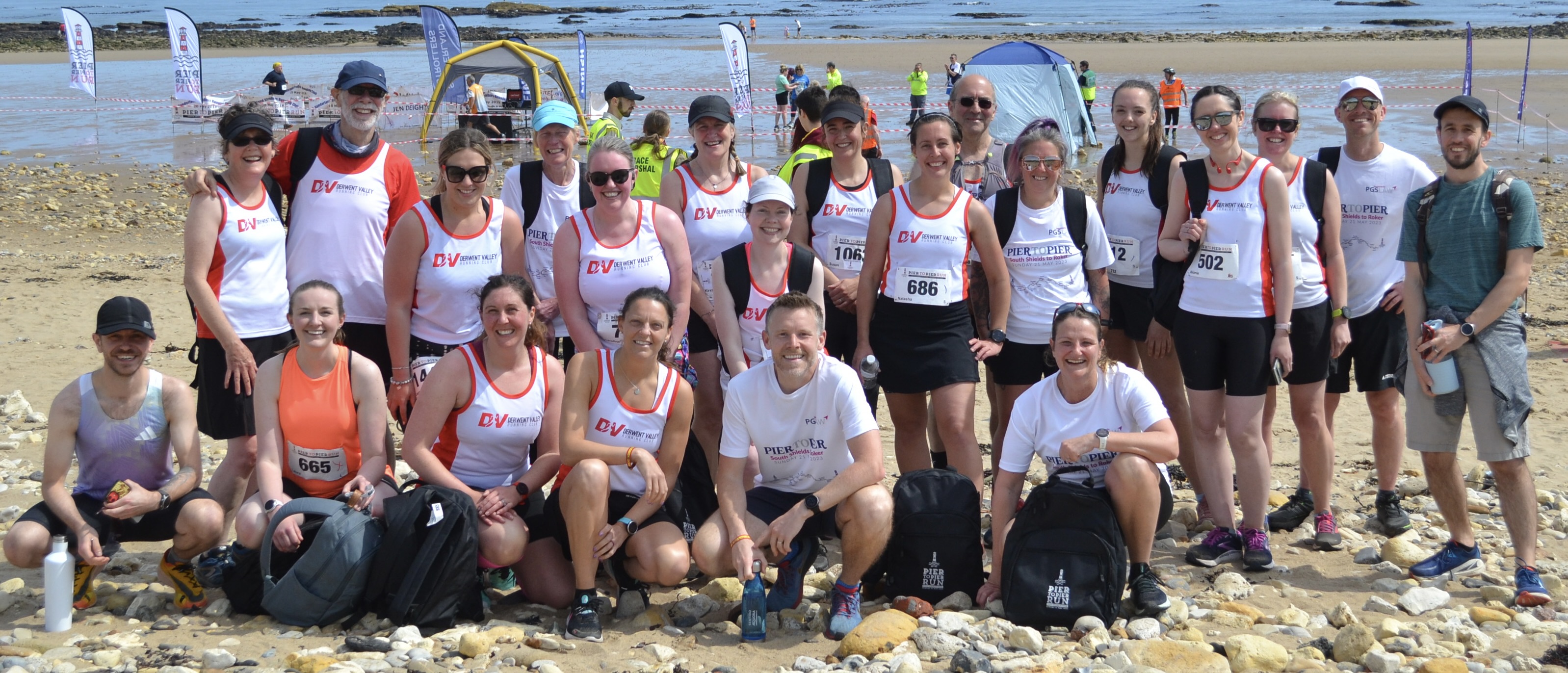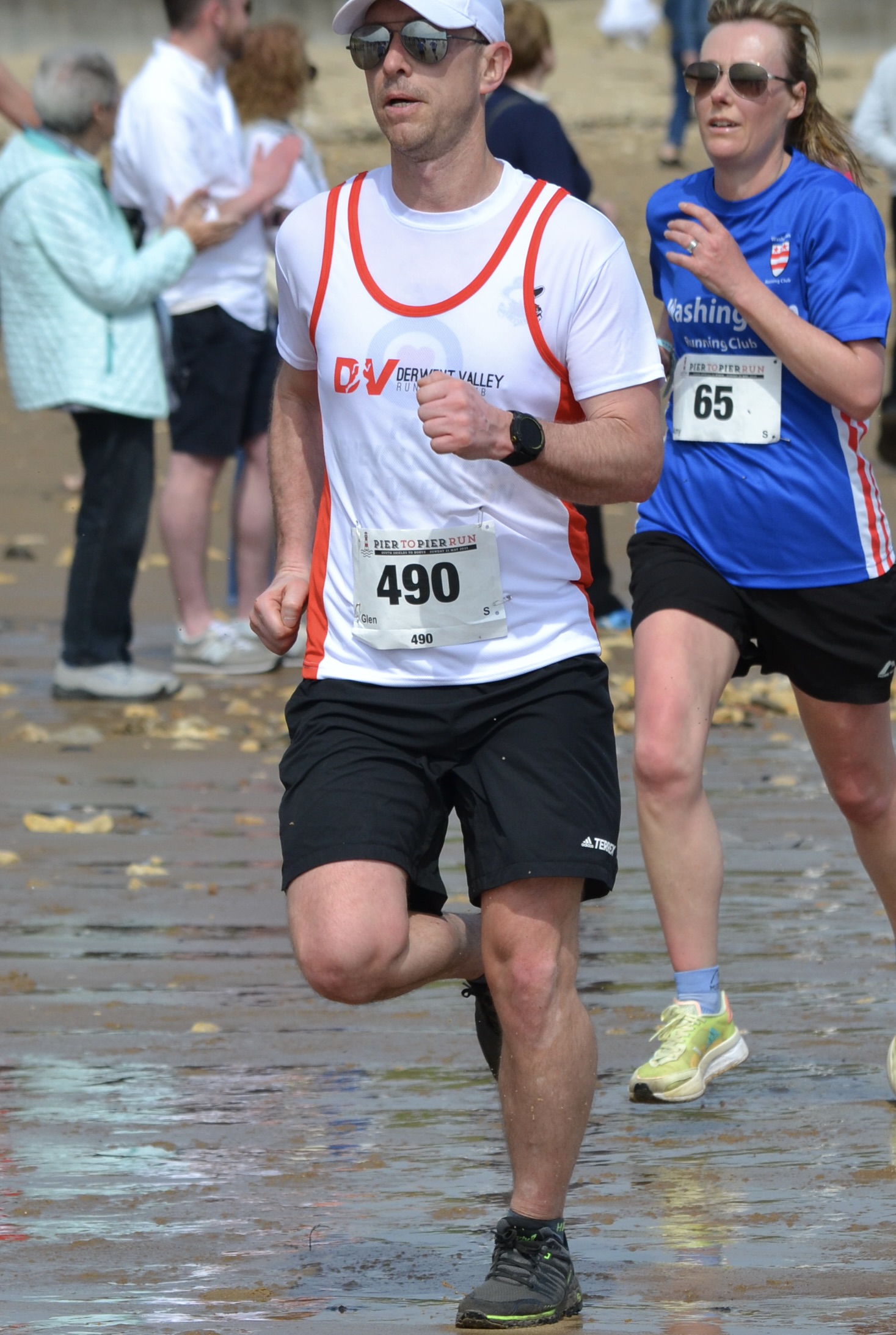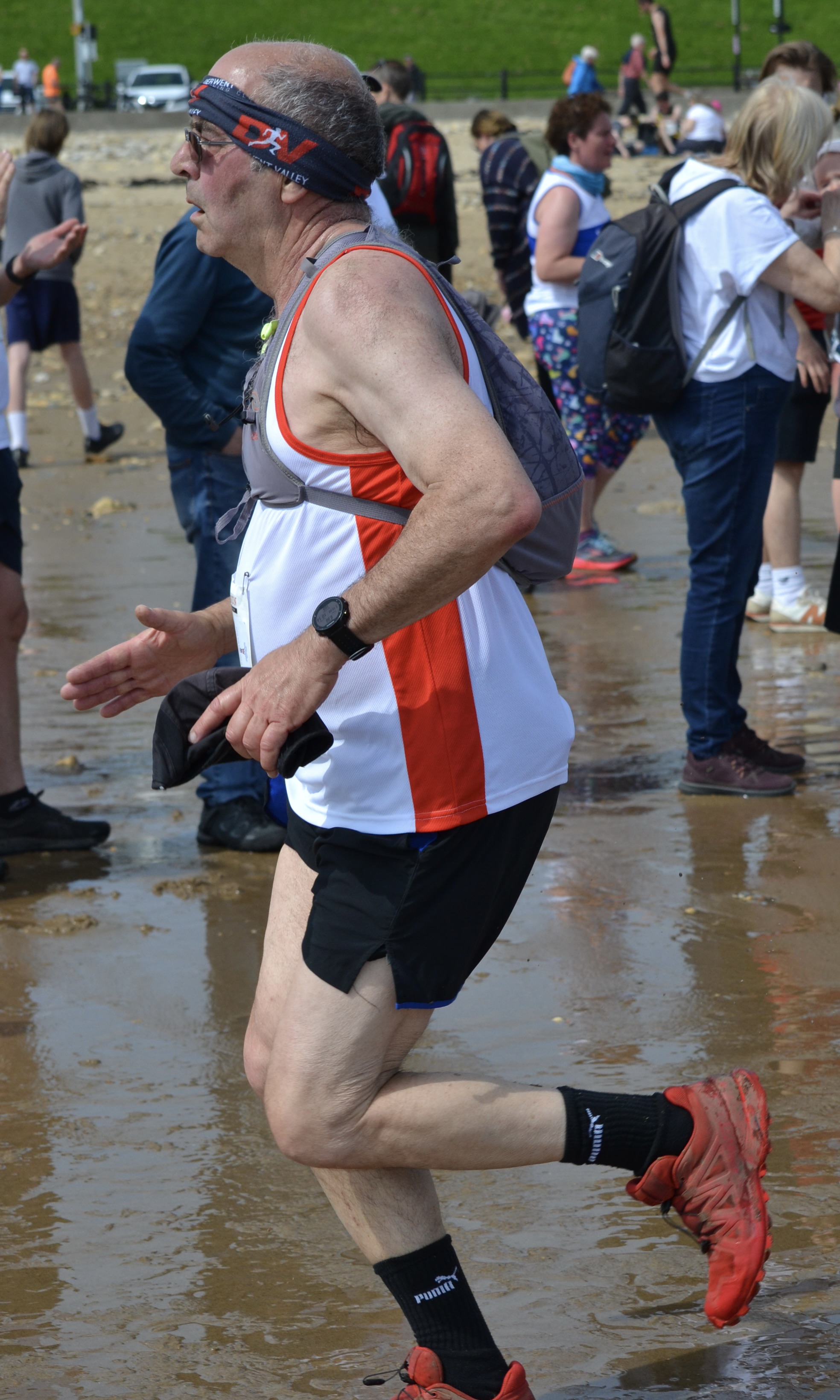 Headed with another huge contingent, the white and red vests dropped onto the sand at South Shields for the 11km trip south to the beach at Roker. The early morning sun beating down and making those who forgot the sunglasses very envious of the likes of Lindsey and Glen, who, no doubt, stepped off the plane from Alcudia wearing them and straight onto the bus to the start…
