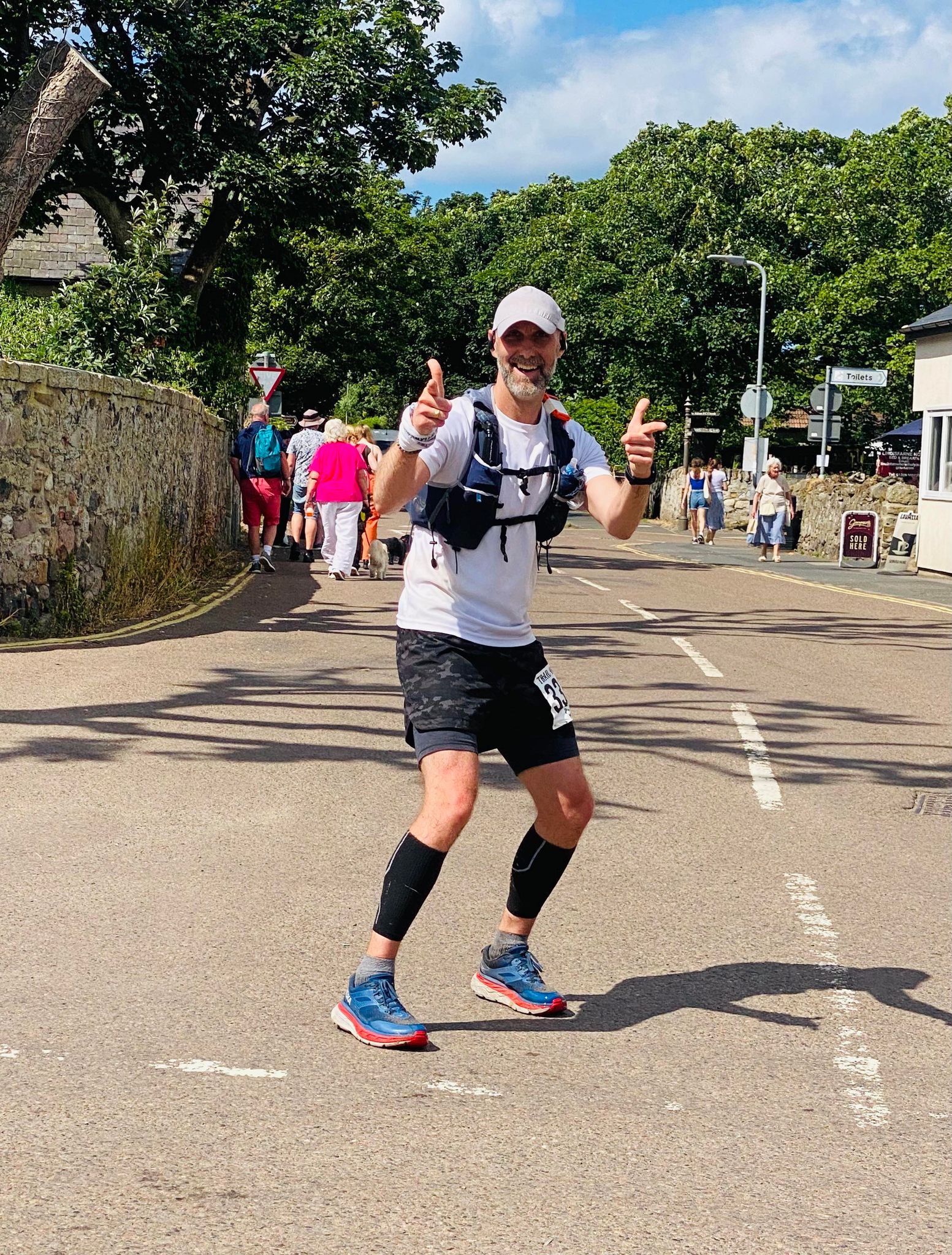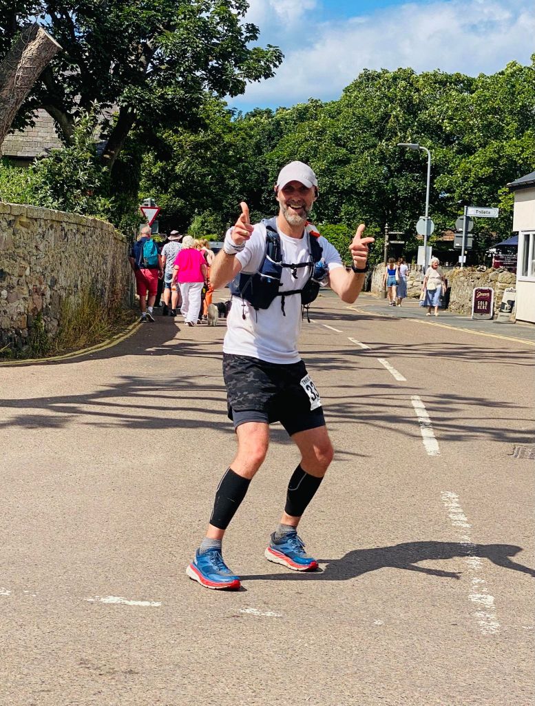 “Marc did the St. Cuthbert’s Way 100k (well 65 miles) He set off at 10:30pm from Melrose in the Scottish borders to head straight over the Eldon hills (part of the Jedburgh 3 peaks race). He had a great race through the night hours, holding 2nd or 3rd place for many hours. Unfortunately, the next morning painful stomach issues and the heat almost put an end to his race. Thankfully, he pushed on with determination* and and having lost lots of places he managed to pass quite a few again to finish 21st out of 72 starters of which 25 DNF’d-due to really tough hot conditions! He was told by Trail Outlaws that he was the first person to actually follow the real SCW path and trudge over the marshes onto Holly Island , rather than the usual causeway road route – genius!”