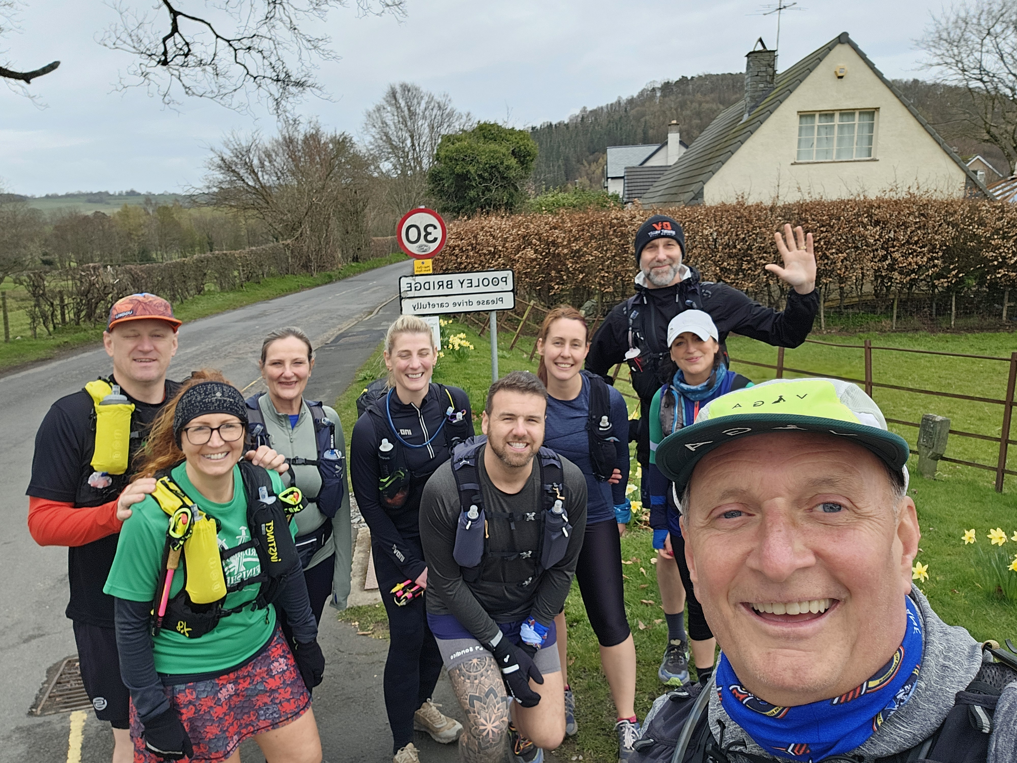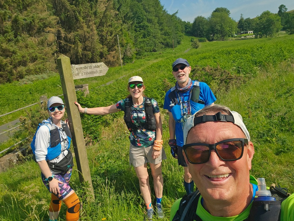 Onto race weekend itself & I think approx. a dozen of us from DVRC headed over. After waving off the DVRC LL100 contingent at 6pm Friday, those of us that were doing the 50 version prepared ourselves for our start on Sat morning. My hydration strategy / plan was to top up with water my hydration pack at each CP & then adding SiS Electrolyte powder also at each CP to keep me going. However this plan went a bit oblong approx. 400m after the start when my hydration pack developed a leak resulting in SiS electrolyte dilute mix pouring down my bum & legs. My fellow race competitors helpfully pointed this out but once I’d heard ‘you’ve got a leak mate’ for the 93rd time it started to get a bit tedious. So I was left with approx. 49.5 miles to go with only a solid cup to be used at CP’s for pasta, soup, etc & a small 250ml flexible flask that could be used for my fluids. I was a bit concerned – but at each CP I managed to gorge on water / juice & filled up the small flask with flat cola to keep me going until the next CP – & this seemed to work relatively successfully. Weather in the main was ideal (from what I can remember) & it was an absolute bonus at most CP’s seeing fellow DVRC Competitors (naturally they were leaving as I was arriving!) giving each other a cheery wave & a small comment of motivation.